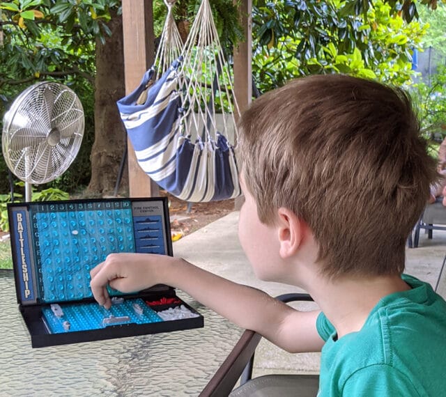 Battleship is the perfect game to play across the patio. (Beware: Nine-year-olds are known to be board game sharks.) Photo by Christy Nicholson.