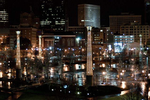 Staying near Centennial Olympic Park in midtown Atlanta provides easy access to popular attractions and a beautiful view of the park’s light towers. Photo by Paul Nicholson.