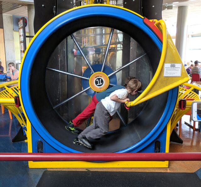 Our boys used this giant hamster wheel to power a three-story ball machine at the Saint Louis Science Center. We could probably save money on electricity if we install one of these at home. Photo by Paul Nicholson.