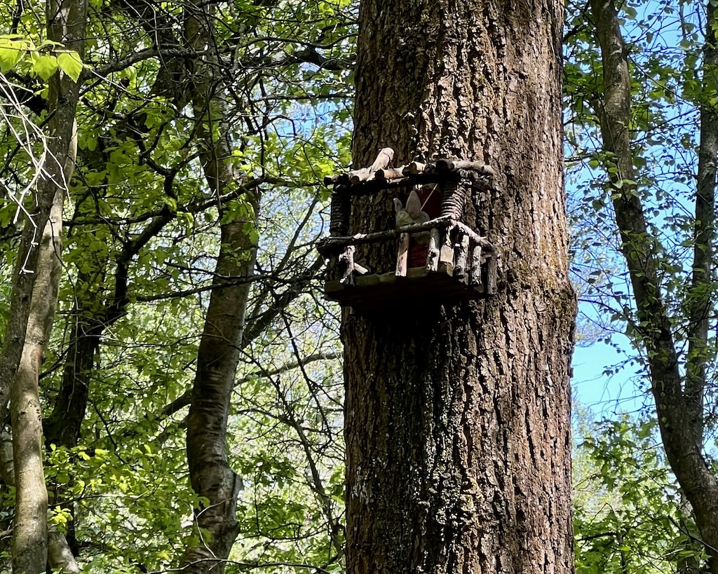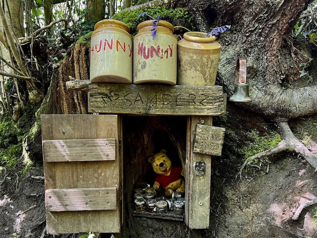 The path we took wound through the forest past many key characters’ homes, culminating shortly after the Pooh Sticks bridge. We found Owl’s home high in a tree, and greeted Piglet as he looked down on us from his tree-top balcony. Winne-the-Pooh was home when we came to knock, happily surrounded by pots and pots of honey. It took some time to convince my daughter that Pooh would probably rather stay in his cozy nest than come to live at our house, but I did manage it in the end.